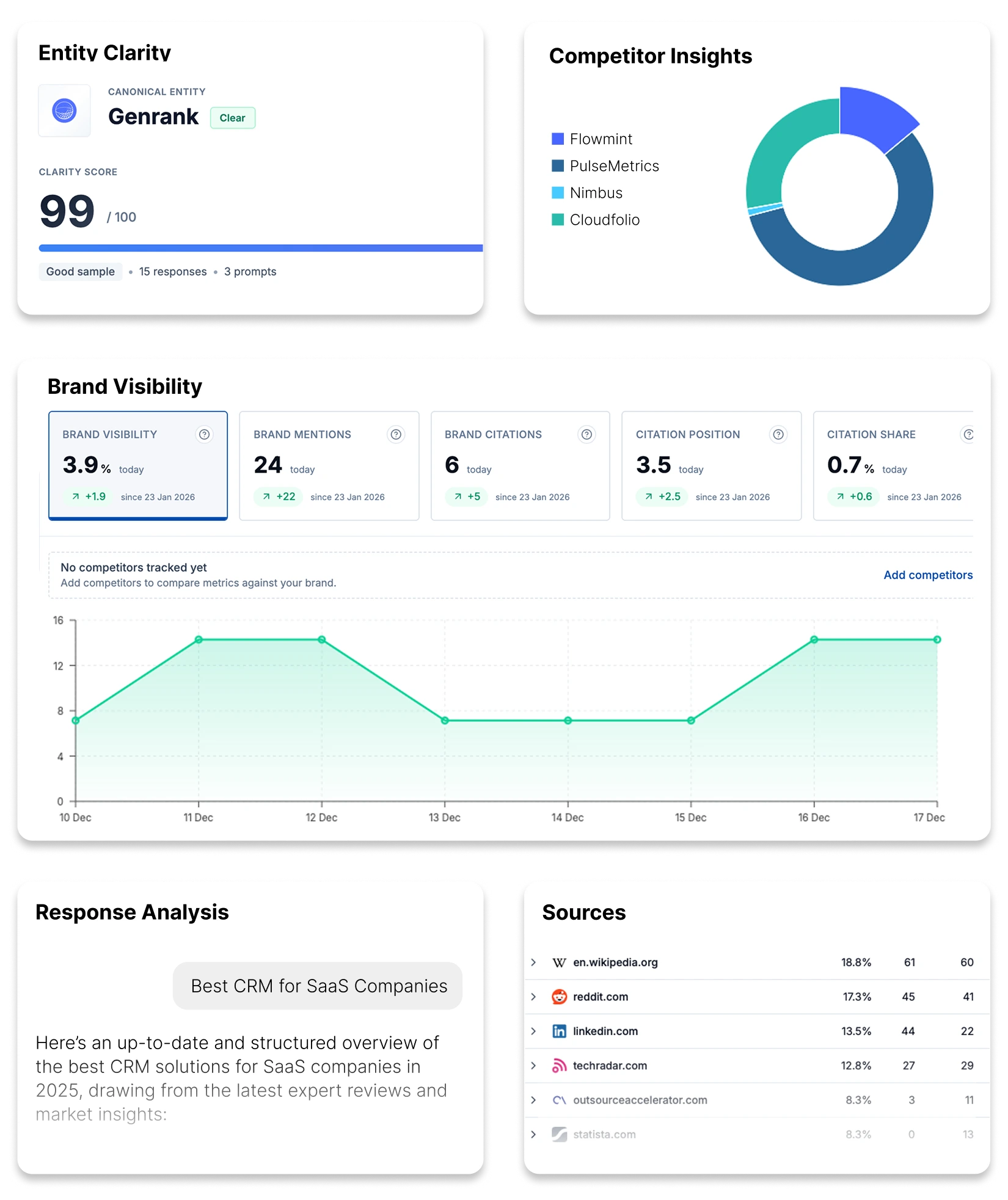 The best ways to track brand mentions in AI search involve working with real prompts instead of assumptions, collecting full AI responses instead of summaries, and storing historical outputs for comparison. Reliable tracking requires consistent prompt execution and transparent mention detection. A purpose-built ChatGPT brand tracker like Genrank follows this methodology to ensure that visibility insights are based on verified AI outputs rather than estimates.All mentions come from real responses, each response is stored for review, historical data shows changes over time. No guesswork, only verified outputs.